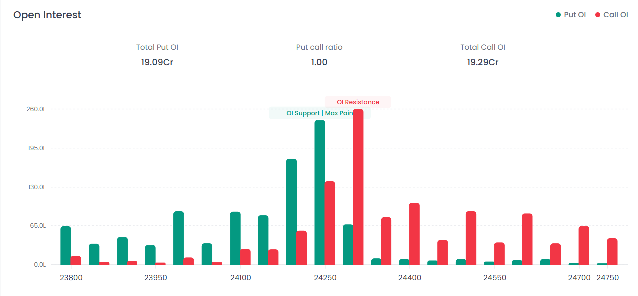 Near Support: 24,250 The 24,250 strike is acting as the immediate base with significant Put writing. Total Put OI for the session stands at 19.09 Cr.