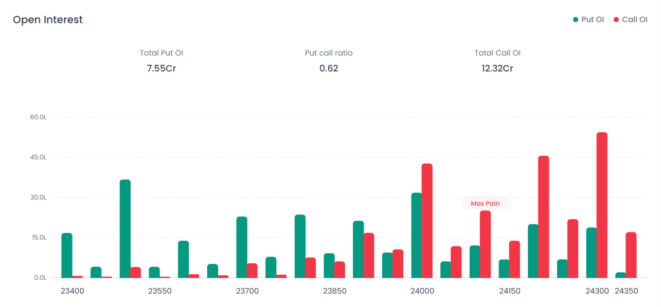 Near Resistance: 24,300 The 24,300 strike stands out as a massive hurdle, showing the highest Call OI concentration. Total Call OI for the session stands at 12.32 Cr.