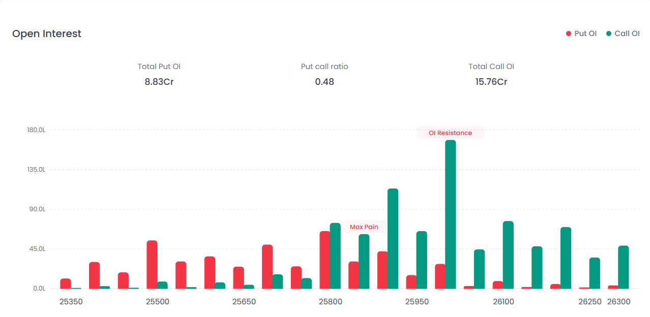 Near Support: 25,800 The 25,800 strike shows the highest Put concentration. The Total Put OI stands at 8.83Cr, suggesting a base, though significantly lower than the call side.