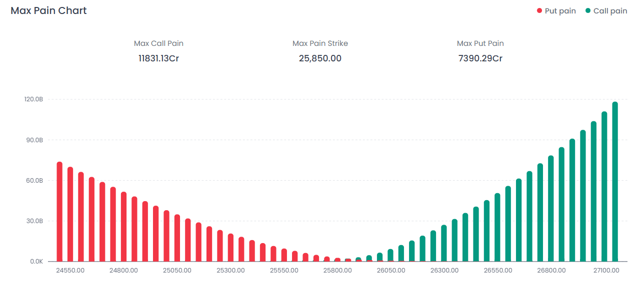 The Max Pain Strike is currently pegged at 25,850.00. With the market closing at 25,807.20, the index is pinned close to this level, which represents the point of least aggregate loss for option writers.