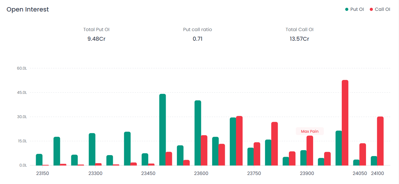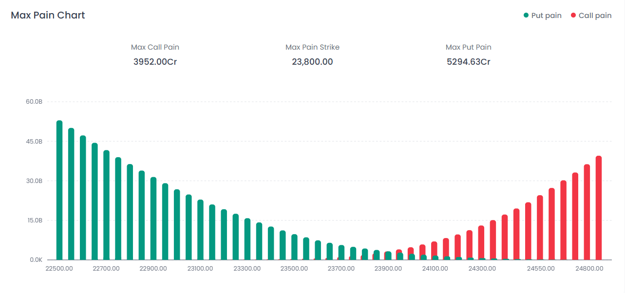 The Max Pain Strike is currently pegged at 23,800.00. With the market closing significantly below this level at 23,639.15, the index is currently trading in a zone that puts maximum pressure on Put writers.