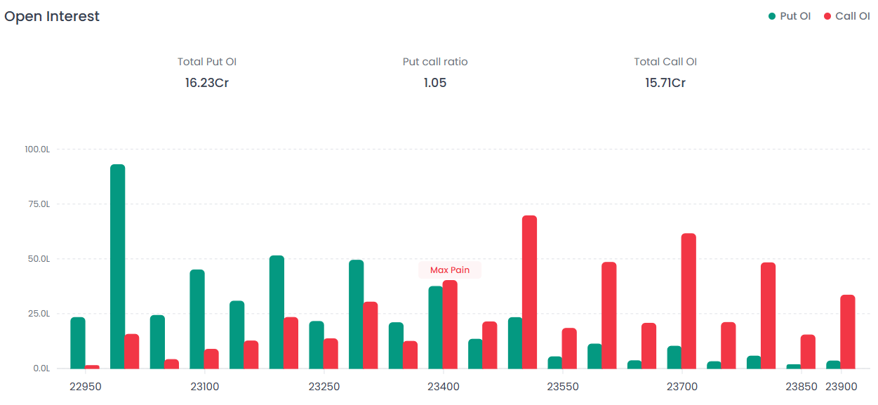 Near Support: 23,000 On the downside, the 23,000 strike shows a massive buildup of Put OI, acting as a strong floor. Total Put OI for the session stands at 16.23 Cr.