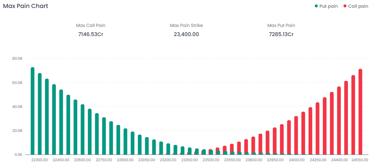 The Max Pain Strike is currently pegged at 23,400.00. With the market closing almost exactly at this level (23,408.80), the index has settled in the zone of maximum efficiency for option sellers, neutralizing the pressure between Call and Put writers.