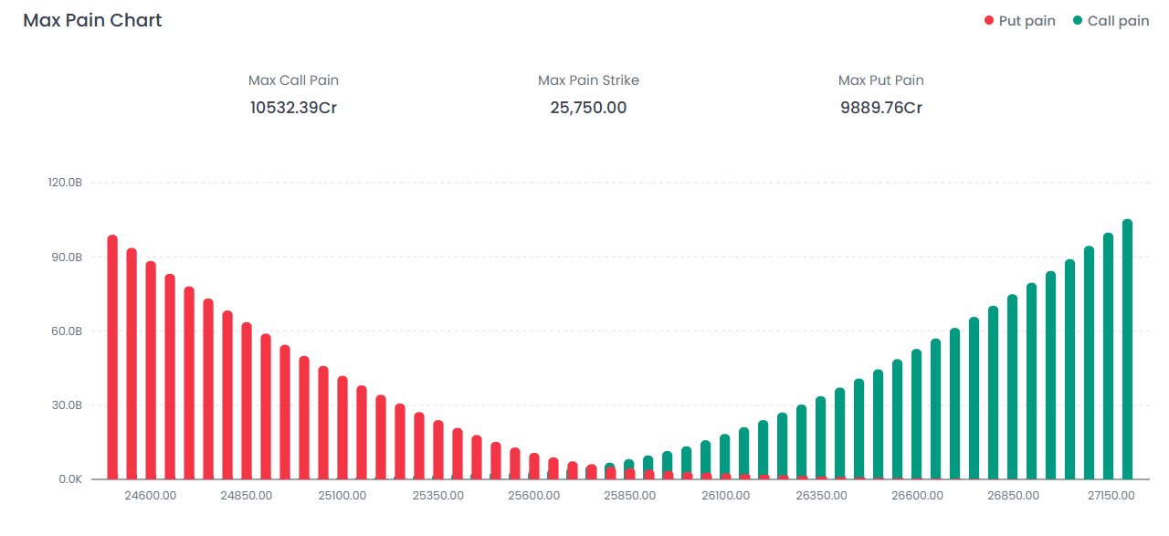 The Max Pain Strike is currently pegged at 25,750.00. With the market closing at 25,819, the index is positioned slightly above the zone where option writers stand to lose the least, though it remains within a relatively efficient alignment for the current expiry setup.