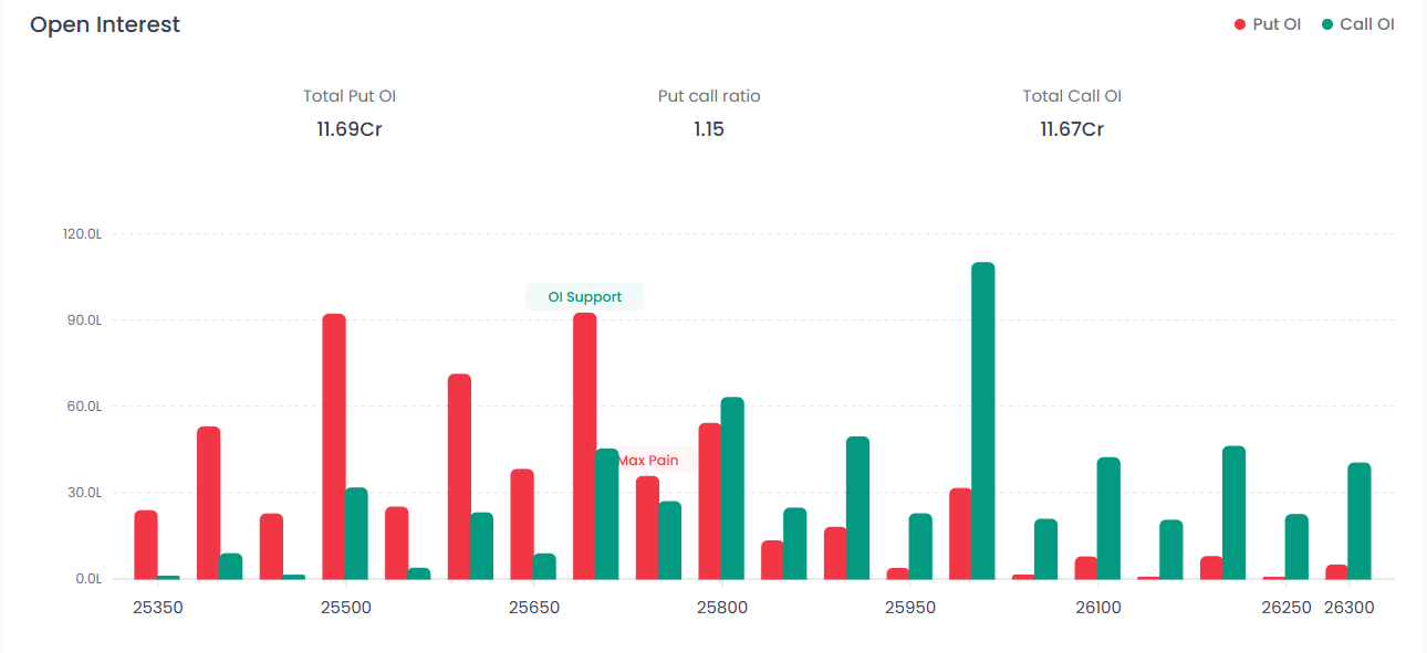 Near Support: 25,700 The 25,700 strike has become the immediate battleground and strongest base. Total Put OI for the session stands at 11.69 Cr.