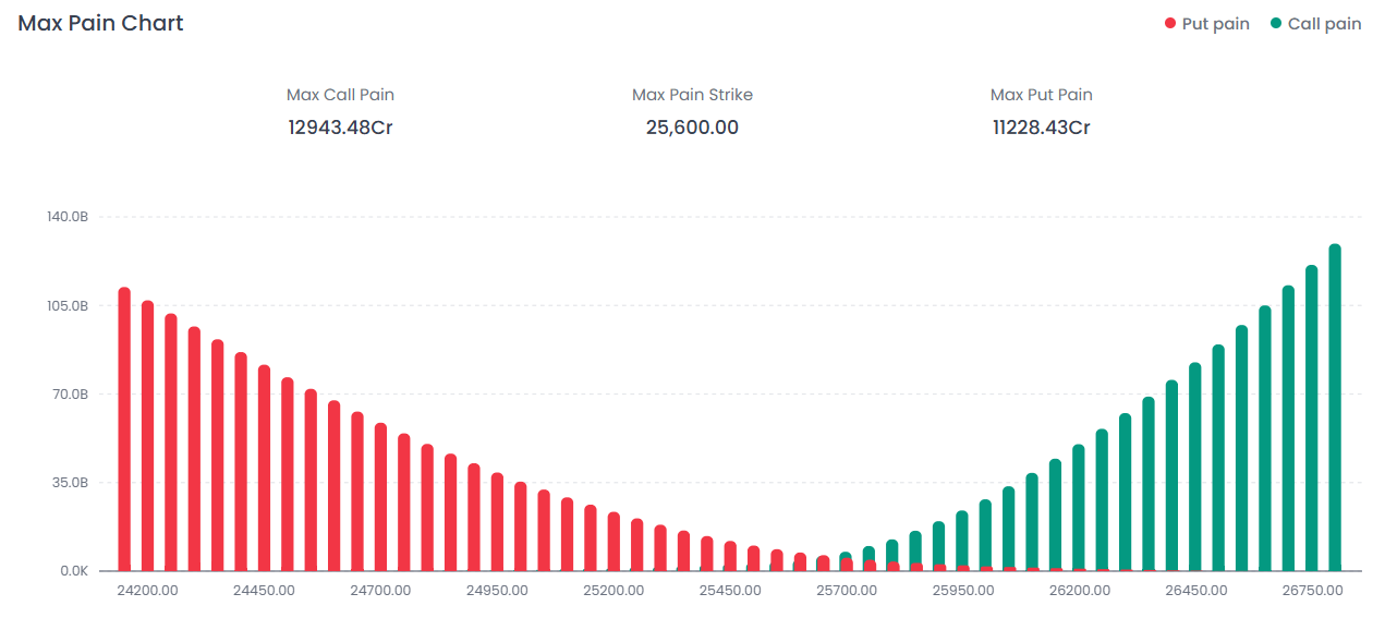 The Max Pain Strike is currently pegged at 25,600.00. With the market closing at 25,404, the index is positioned well below the Max Pain level, suggesting that option sellers (particularly Put writers) faced significant pressure during today's expiry/session.
