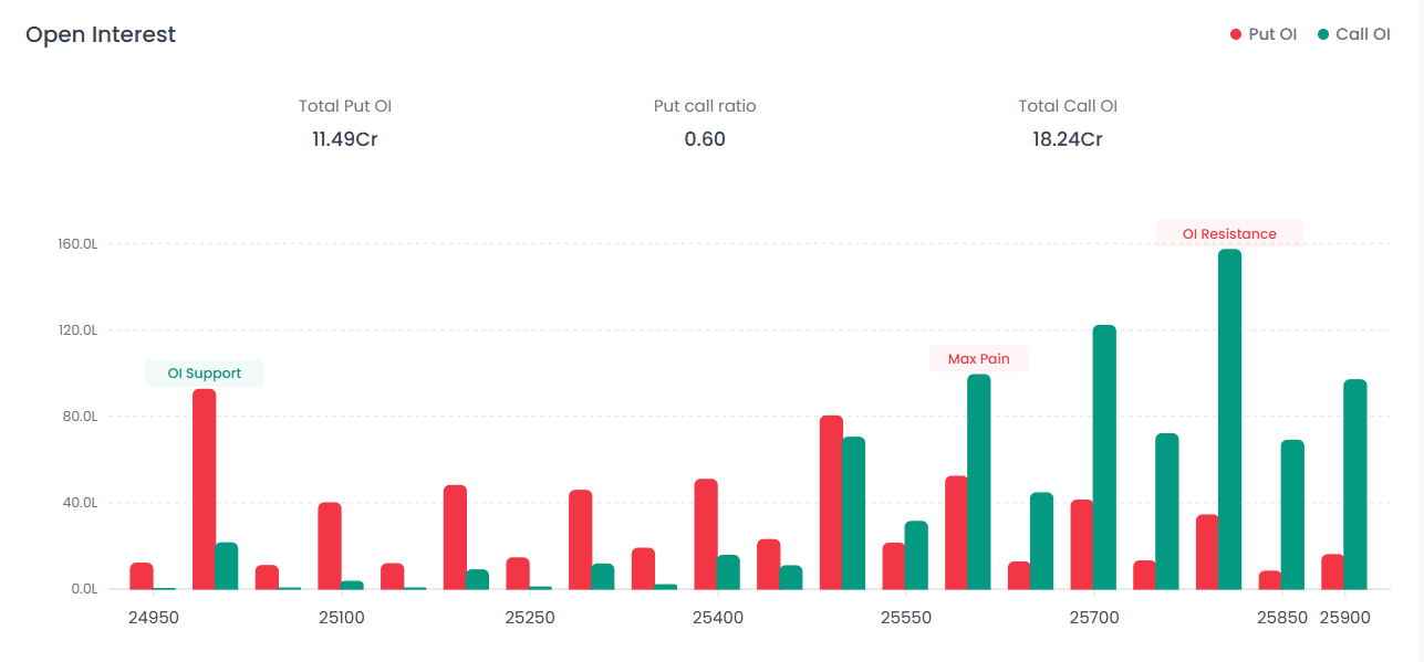 Near Support: 25,000 The 25,000 strike (highlighted as OI Support) remains the primary base, though immediate cushions are thinning. Total Put OI for the session stands at 11.49 Cr.