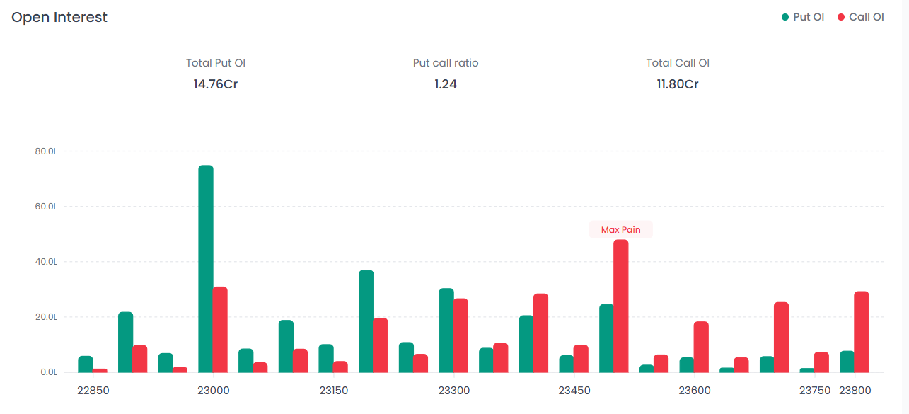 Near Resistance: 23,500 The 23,500 strike stands out as a major hurdle with a high Call OI concentration. Total Call OI for the session stands at 11.80 Cr.