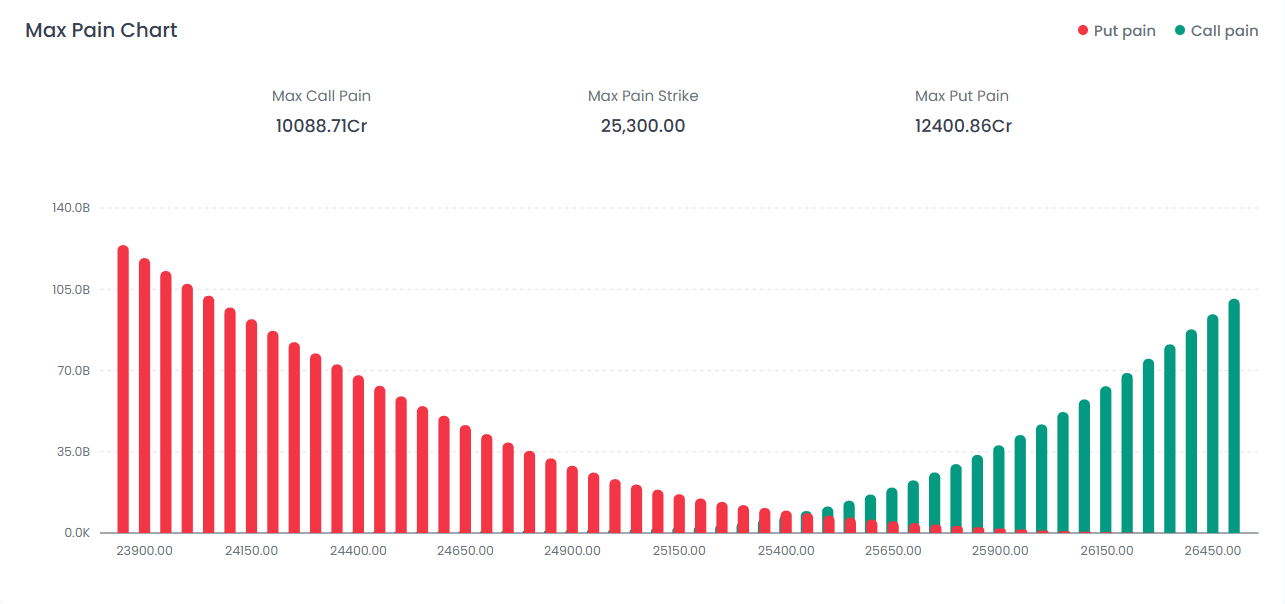 The Max Pain strike stands firm at 25,300, significantly higher than the current market price (~25,157). The data reveals that Max Put Pain (12,400.86 Cr) noticeably outweighs Max Call Pain (10,088.71 Cr), indicating that Put writers are currently trapped and under stress. This divergence creates a strong "magnetic pull," suggesting the market may attempt a relief rally toward 25,300 to minimize losses for option sellers, despite the prevailing bearish sentiment.