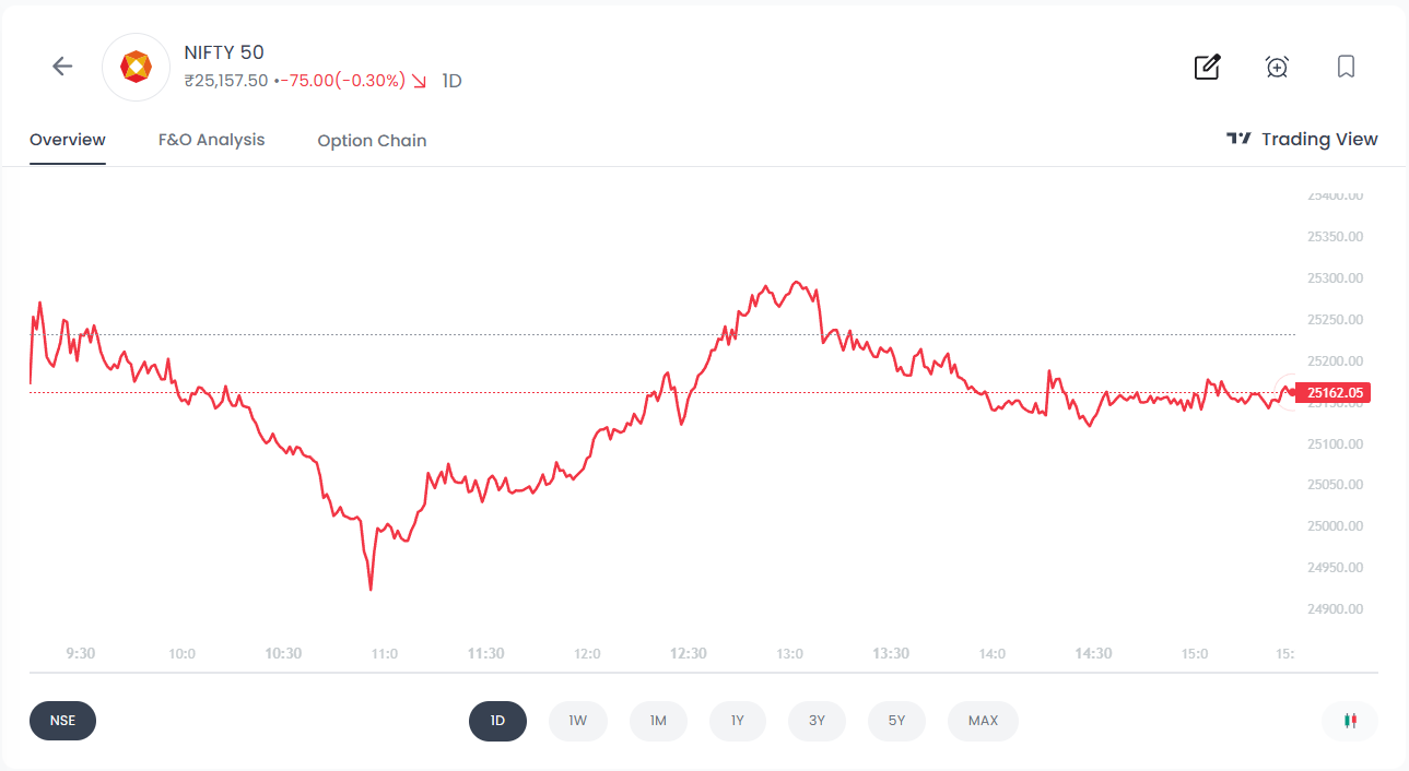 The Indian stock market closed marginally lower today with Nifty 50 ending at 25,157.5, down 75 points or 0.3%, after witnessing a sharp intraday recovery from below the 25,000 level.