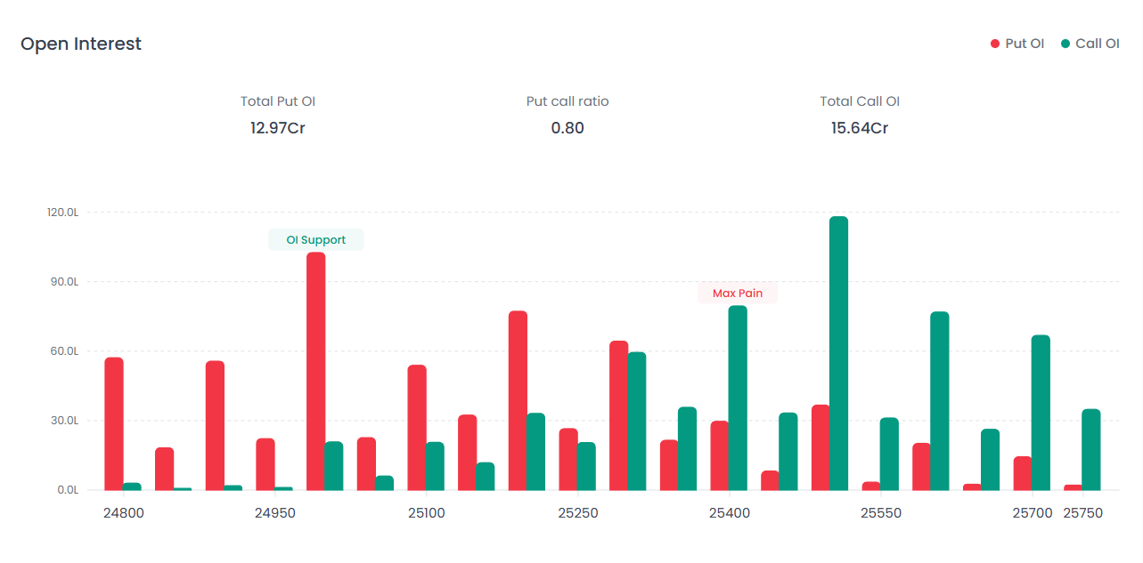 Near Support for the Week: 25,000Significant weakness is visible as the primary support is established at 25,000 (marked as "OI Support"). This strike now holds the highest concentration of Put writing. The solidification of the "Floor" at this psychological level confirms that bears have defined the market's safety net here. A breach of this 25,000 level could trigger aggressive selling.