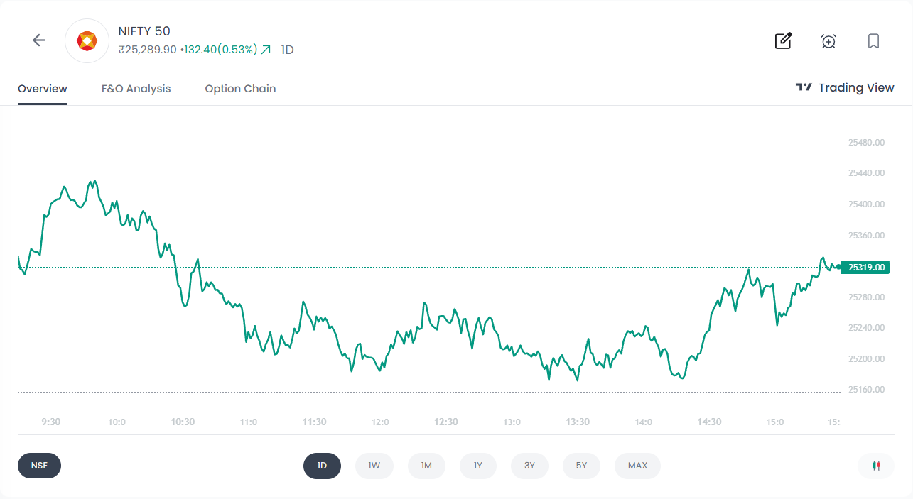 Intraday Analysis: The market displayed resilience after an initial bout of volatility and a mid-session decline. Unlike the previous reading which suggested weakness, today witnessed a solid recovery from the intraday lows. The Nifty held firmly above the support zone of 25,160, refusing to succumb to bearish pressure and staying well above the 25,000 psychological mark. The index rebounded significantly from the bottom to settle near 25,290. The market texture has shifted to "Buy on Dips," indicating that bulls are actively defending higher support zones and utilizing corrections to accumulate positions.
