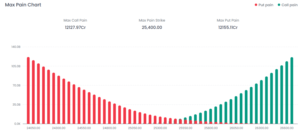 The Max Pain strike stands firm at 25,400.00. The data reveals that Max Put Pain (12,155.11 Cr) is marginally higher than Max Call Pain (12,127.97 Cr), indicating a balanced tug-of-war where neither Put nor Call writers are significantly more stressed than the other. This convergence creates a "neutral anchor," suggesting the market may consolidate near 25,400 to minimize losses for option sellers on both sides, reflecting an equilibrium in market sentiment.
