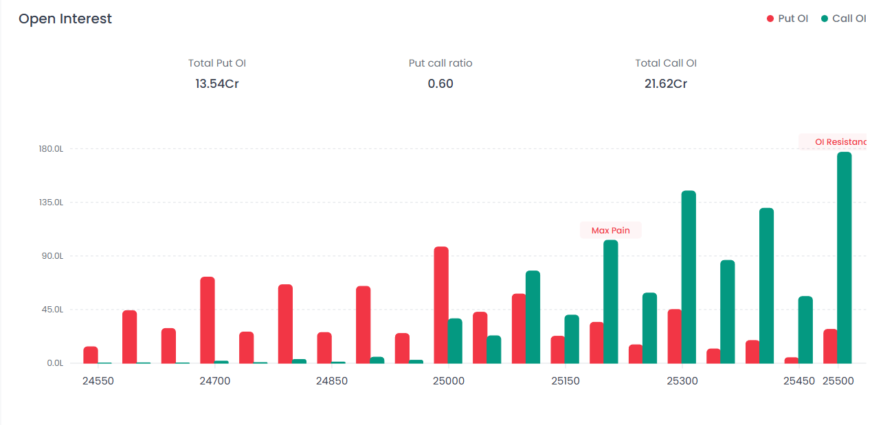 The market often gravitates toward this level by expiry to inflict the least amount of loss on Option Writers (smart money). This suggests a potential tendency for the index to attempt a pullback toward 25,200.