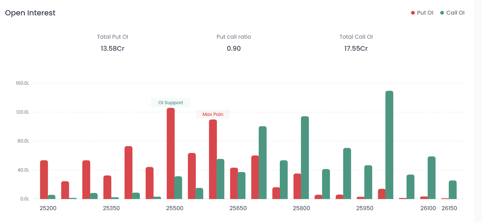 Interpretation: The Max Pain level is at 25,650, which is very close to the current closing price (25,693). This suggests the market is in a "Pinning" zone. Option writers will try to keep the index expiring near this level to maximize their premium retention.
