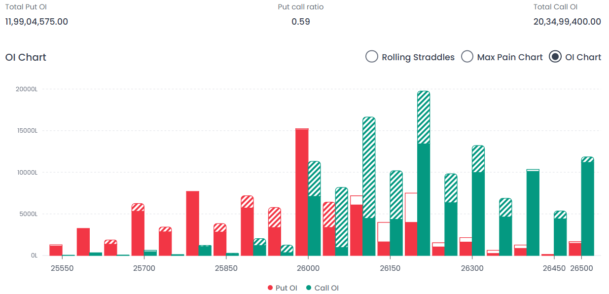 Interpretation:The market is currently under significant bearish pressure, evidenced by the Total Call OI (20.34 Cr) nearly doubling the Total Put OI (11.99 Cr). The index is squeezed between the 26,000 support and the 26,100 resistance. A breakdown below the 26,000 floor could trigger a sharp "Long Unwinding" move, whereas the upside is strictly capped at 26,100 due to the massive Call wall.