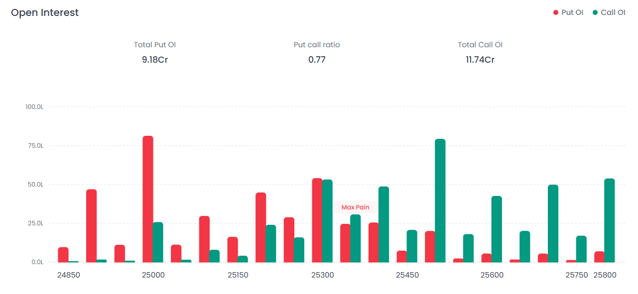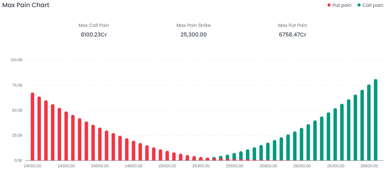 Interpretation: The Max Pain level is currently positioned at 25,300.00, which acts as a pivotal point for the expiry.